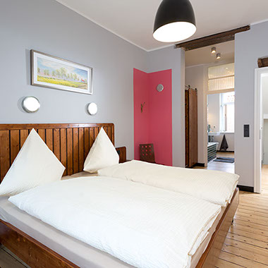 Drei der Wohnungen sind Einzimmerwohnungen mit Doppelbett. Eine Wohnung ist eine Zweizimmerwohnung mit Doppelbett in einem Zimmer und Einzelbett im anderen Zimmer.